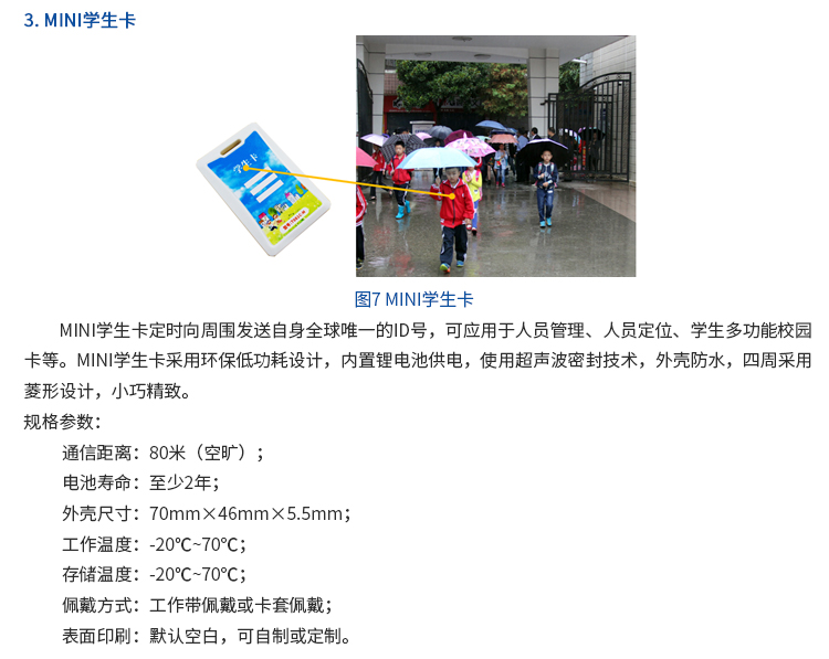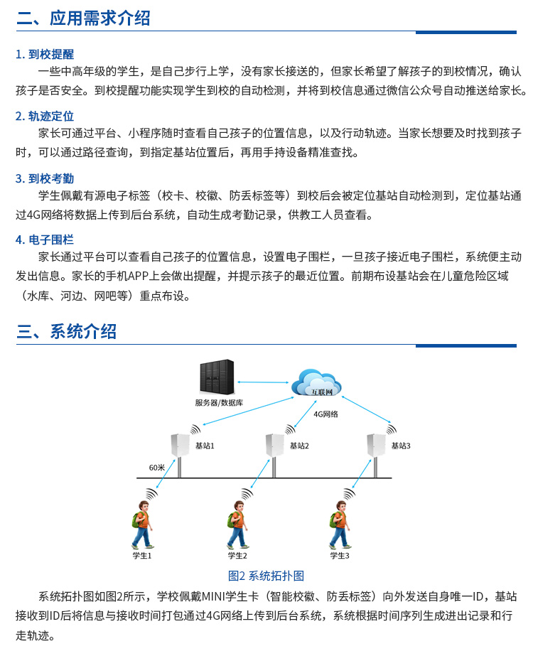 利用有源RFID无线技术的距离远、稳定性等特点,对城镇小区学校的学生进行定位、到校提醒、实时考勤、电子围栏告警。